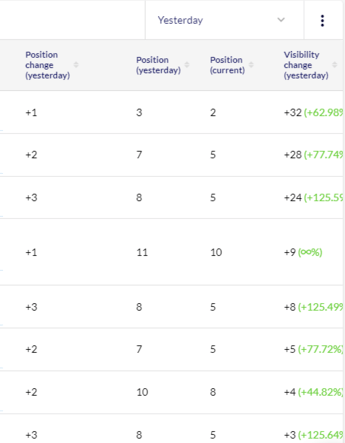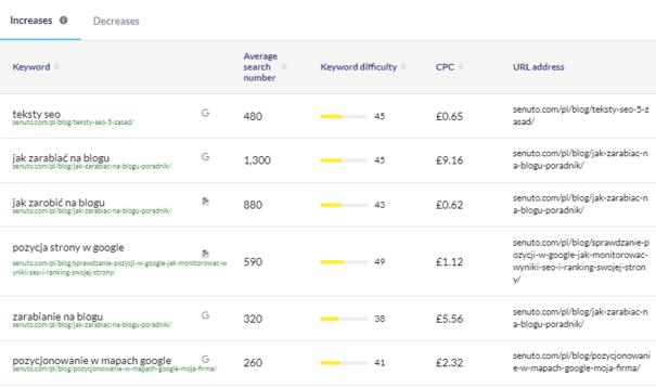 Learn for which keywords the website increased or decreased in rank over a selected period.